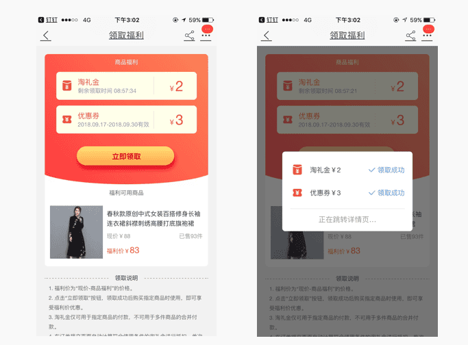 2、完成领取后,直接跳转到商品详情页, “立即购买”。
