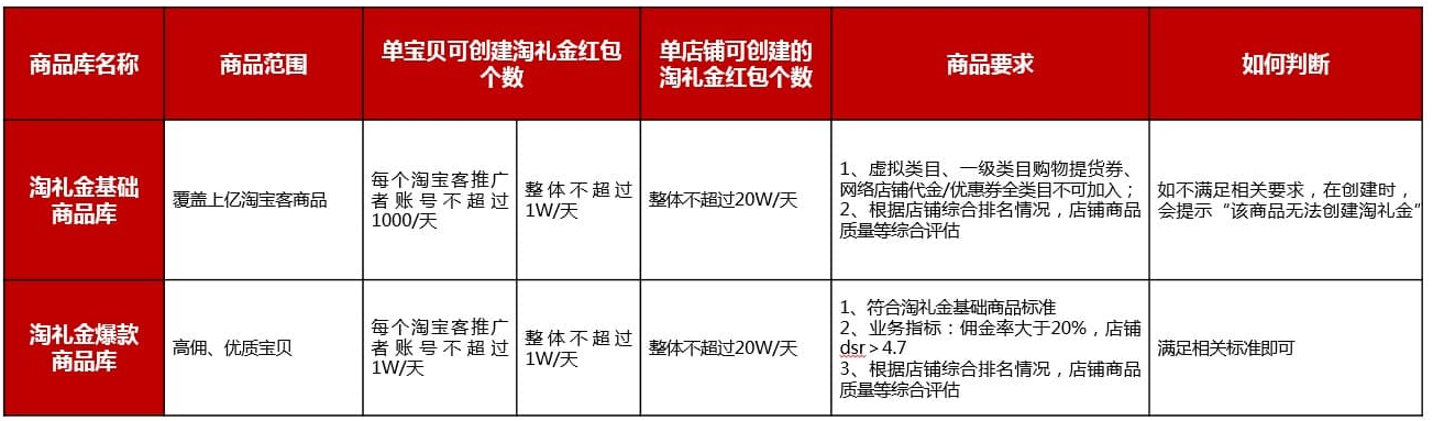 请直接通过淘礼金创建接口调用,如商品在基础商品库中,则可成功创建。如商品不满足基础商品库的准入标准,则会提示“该商品不支持创建淘礼金红包”。