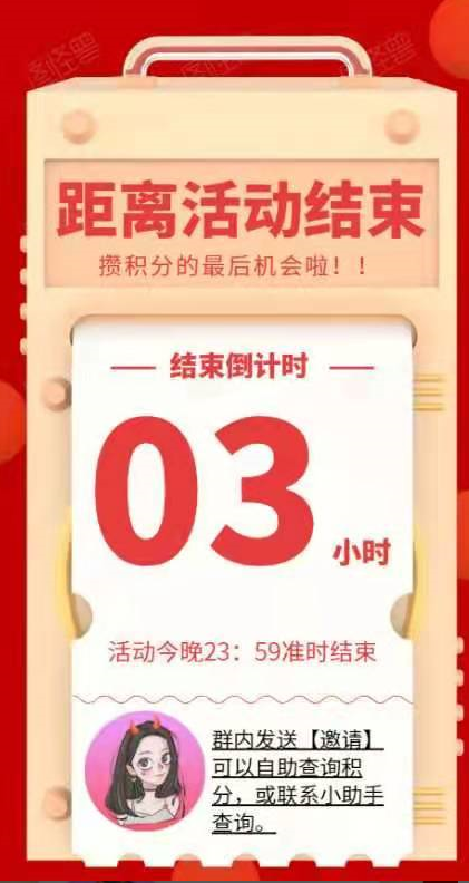 还有3小时活动就要结束啦!还没有邀请好友进群的要抓紧啦!错过今天明天拍断大腿都没有用咯!