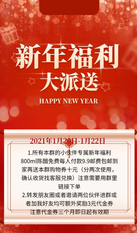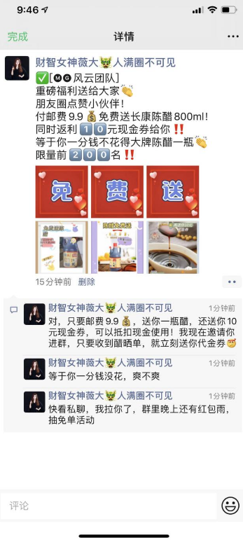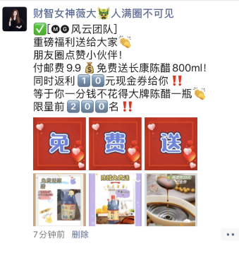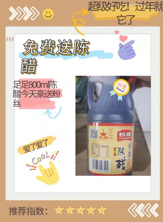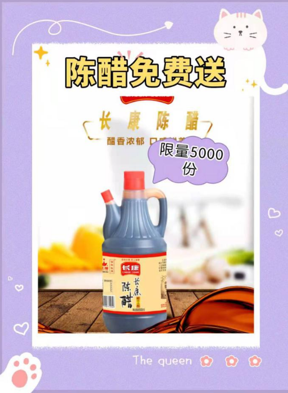 群发文案:我在做活动,长康陈醋800ML免费送,要参加的朋友圈点赞